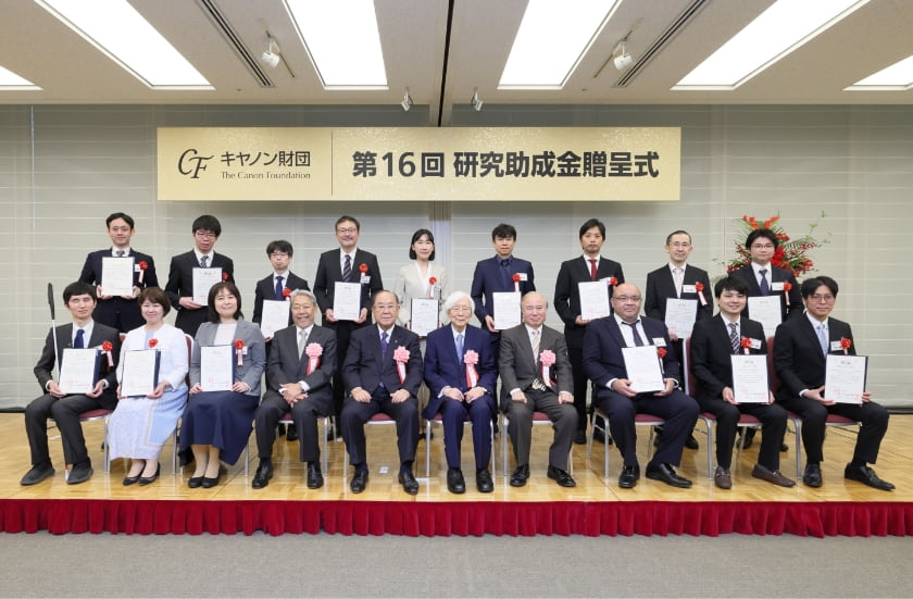 4月18日、東京・千代田区の経団連会館において、キヤノン財団の第16回研究助成金贈呈式が行われました。研究助成先に決定した15名に対し、同財団の評議員会議長であるキヤノンInc.御手洗冨士夫会長から研究助成金贈呈証が授与されました。